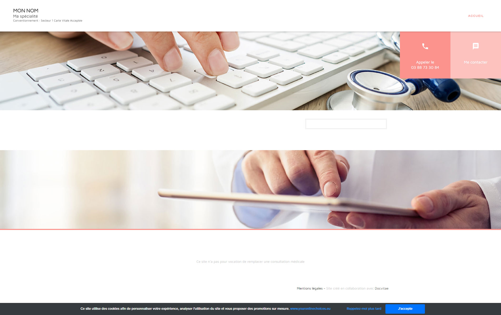 Vous trouverez sur ce site toutes les informations concernant mon activité. Il vous permettra de connaitre en temps réel les horaires de consultation, mes lieux de pratique, les différentes manières de me contacter et/ou de prendre rendez-vous mais également de suivre les actualités du cabinet médical.